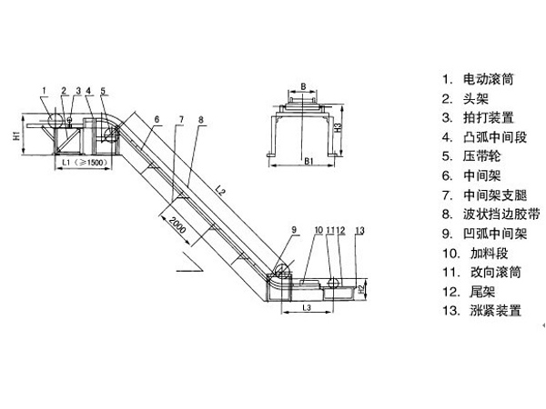大傾角帶式輸送機輸送傾角,采用滾筒電機集中驅動,由:電動滾筒、頭架、拍打裝置、凸弧中間段、壓帶輪、中間架、中間架支腿、波狀擋邊膠帶、凹弧中間架、加料段、改向滾筒、尾架、漲緊裝置。其結構見圖下圖